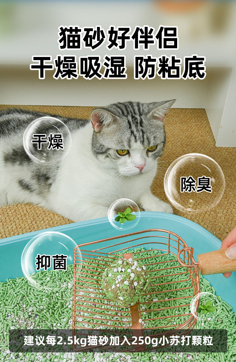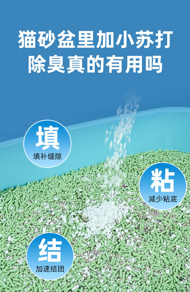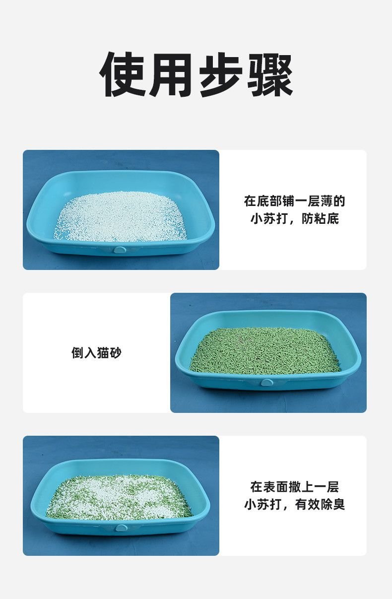 - 在貓砂盆底部均勻撒上一層小蘇打顆粒