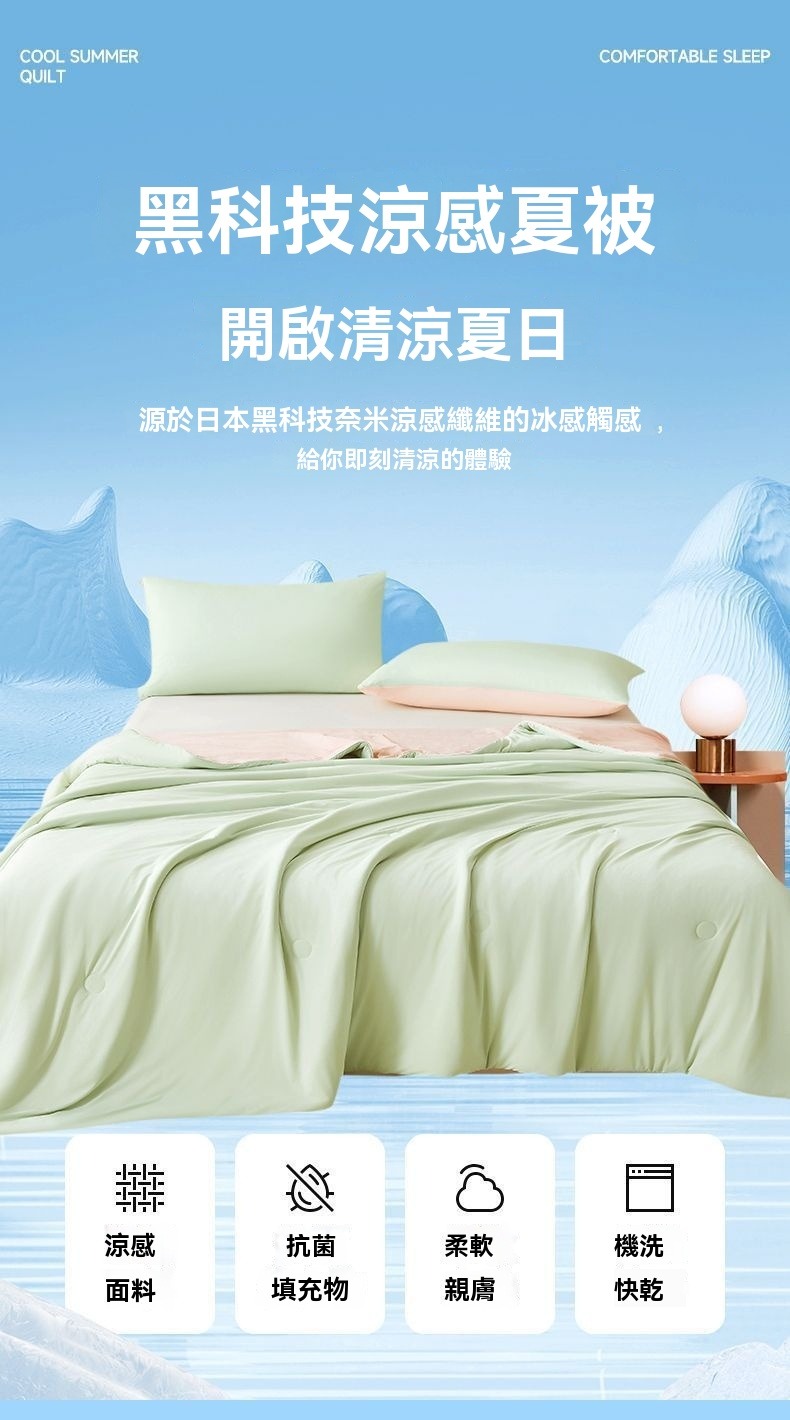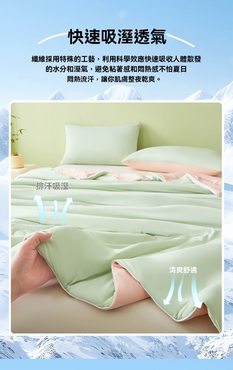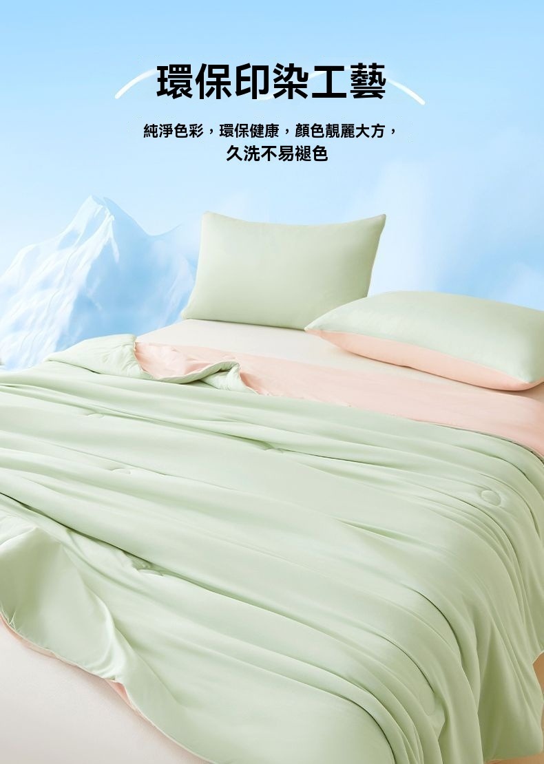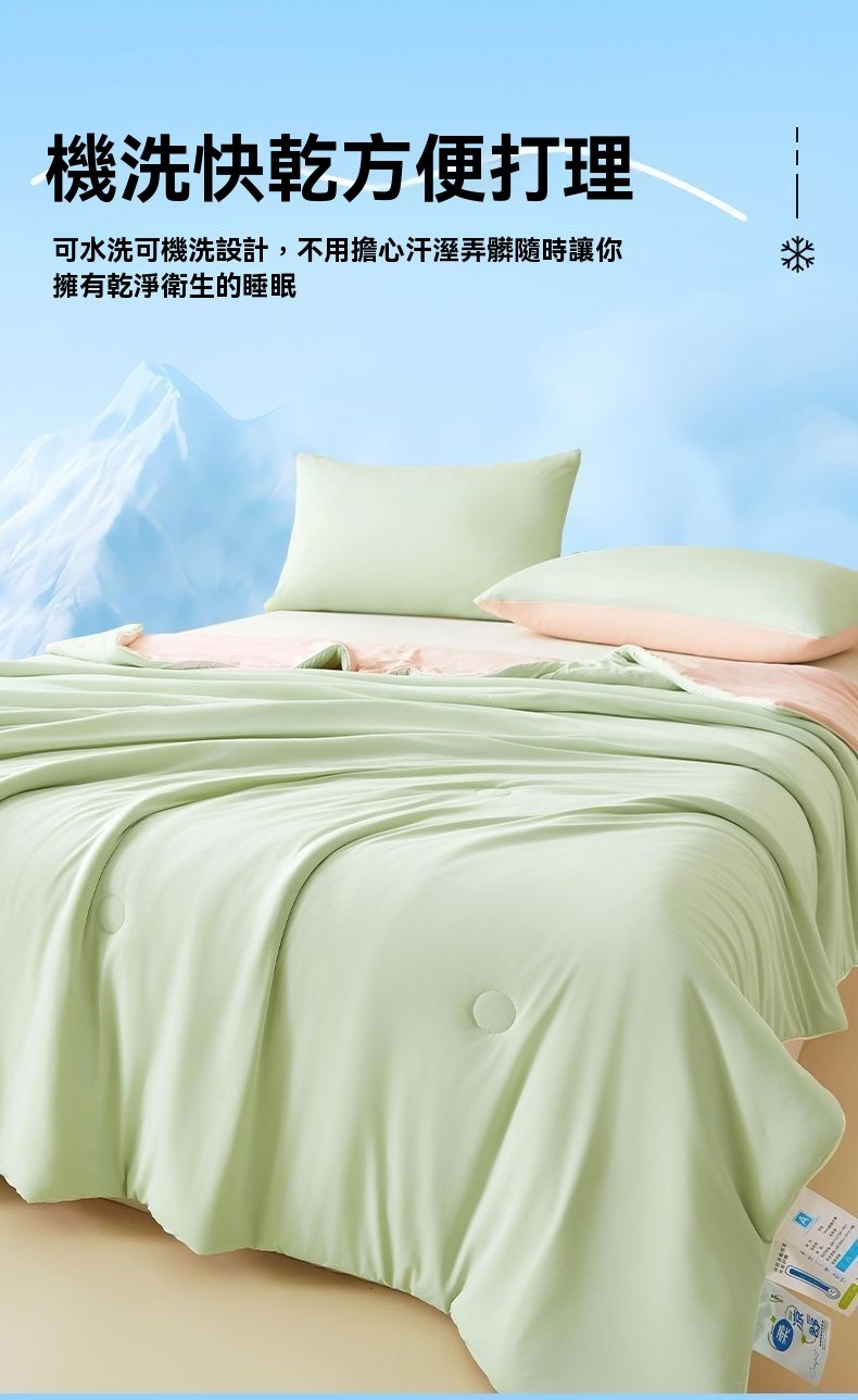 夏日涼爽好眠首選! 雙面設計冰絲涼感被,一被兩用超實惠。採用親膚冰絲材質,觸感柔滑涼爽,輕薄透氣不悶熱。可機洗易保養,夏季必備涼被。